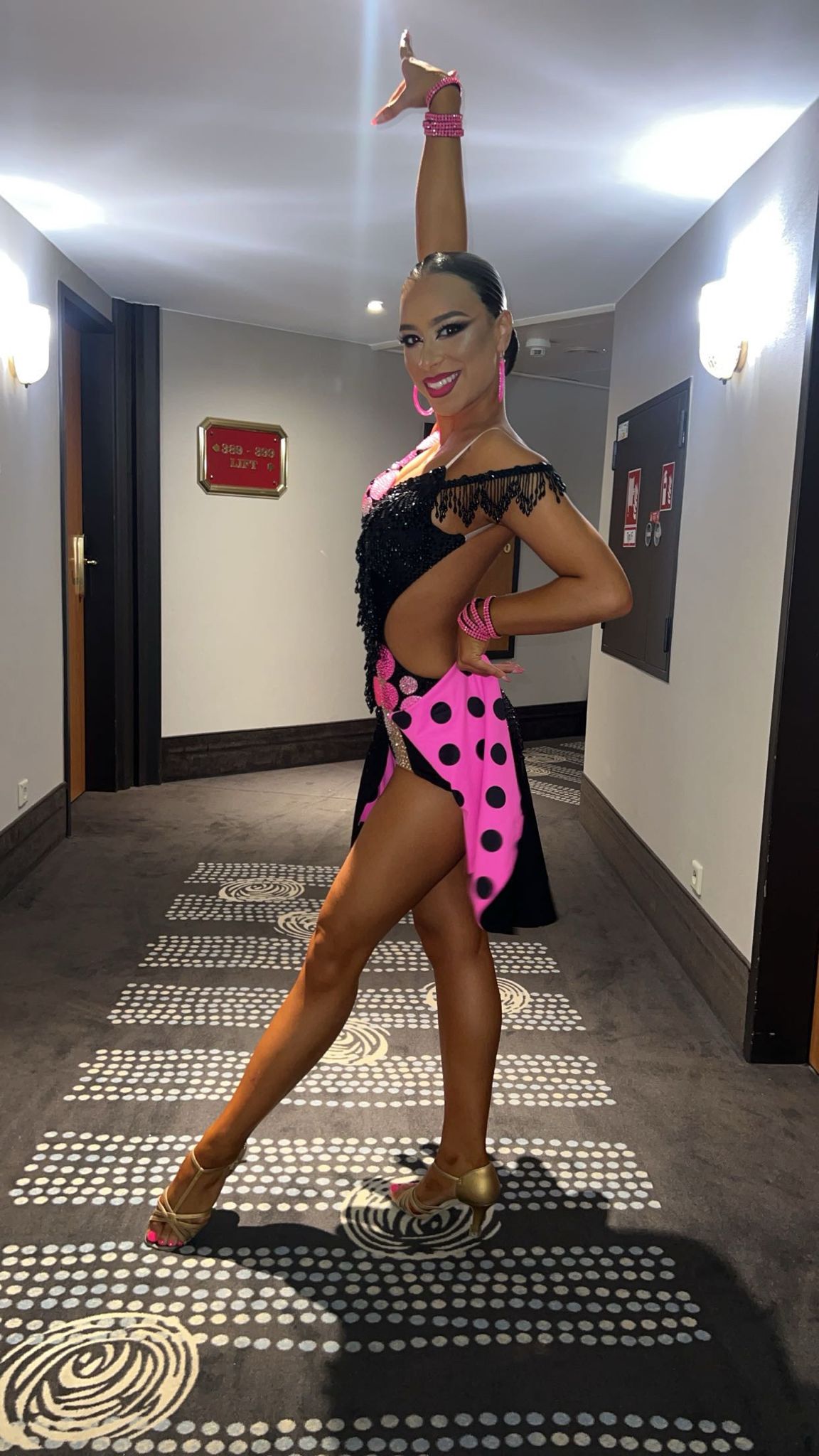 Turn every performance into a statement with our black Latin dress adorned with playful pink dots. This bold yet elegant design perfectly balances drama and femininity, creating a look that stands out on every floor.